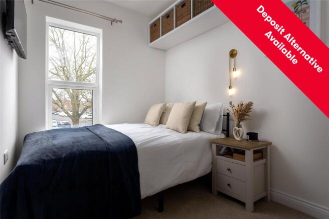 This is the first floor front aspect room within this house share. You have shower room off-suite and furniture includes double size bed with mattress, wall mounted television, bedside drawers, shelving and hanging space.