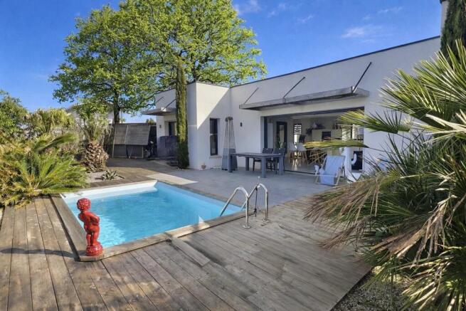 The living room opens onto large terraces with a summer kitchen and onto a landscaped garden of 634 m² featuring a swimming pool.