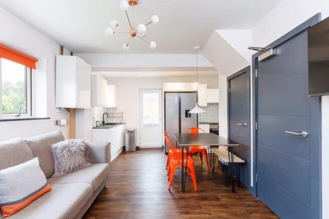 At the heart of the home is the stylish open-plan kitchen and living area. A dining table makes mealtimes sociable, and the open-plan layout flows into a welcoming living space with a wall-mounted flat screen TV and a large L-shaped sofa creating the perfect setup for watching films, sports, or simply relaxing together after a day at uni.