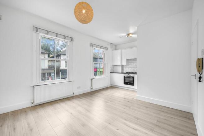 The apartment has been freshly painted throughout and has a reception room with large windows and an open-plan kitchen, a modern shower room, and a double bedroom with built in storage. The apartment has wooden flooring throughout and a private terrace at the rear. Offered furnished or unfurnished.