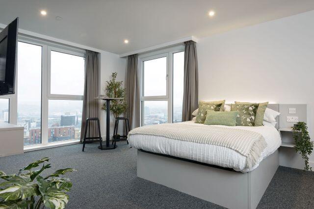 Offering an unbeatable 31.3–36.5 sq m of private living space, it comes furnished with a full sized double bed, a kitchenette with high dining table and two chairs, a dedicated study desk, wardrobe, and a high spec ensuite bathroom featuring a luxurious walk-in rainfall shower. A smartphone controlled heating system allows you to manage your room temperature wherever you are, and all bills are included in the rent.