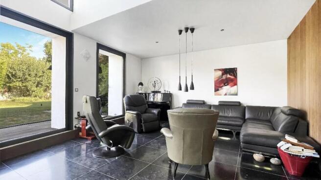 The spacious entrance hall, filled with light, opens to the left onto a warm and inviting living room, perfect for serene evenings. To the right, a large open-plan kitchen and dining area invite connection and joy.