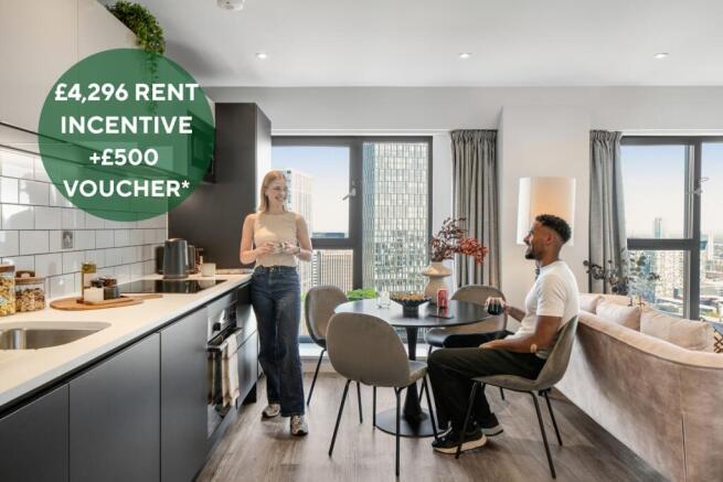 *Ts and Cs - apartments should be reserved by 1st April and move in by 30th April 2026. The rent shown already includes the annual £4,296 discount. Discount and voucher will be given in month 2 of the tenancy. The discount and voucher are for new customers only. We reserve the right to withdraw or amend this offer at any point without prior notice.