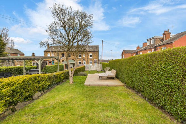 A generous and enclosed outdoor space, mainly laid to lawn and complemented by a timber decked patio and additional paved seating area. Ideal for entertaining, relaxing, or family use, with space for a garden shed.