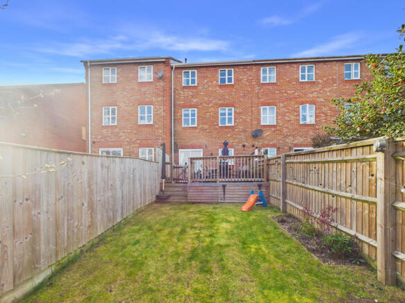 This garden offers a simple, family-friendly outdoor space with a well-kept lawn and a raised decking area ideal for relaxing or entertaining.