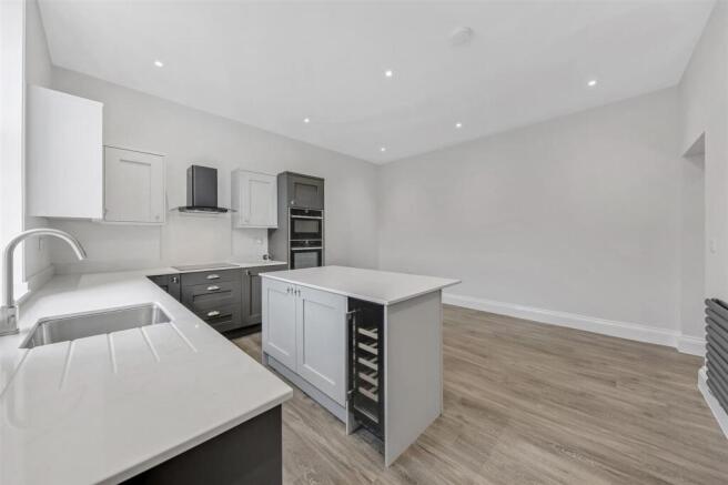 The impressive open-plan kitchen and living area is a real highlight of the home, featuring breakfast bar seating and wine fridge. The modern grey kitchen is both stylish and functional, complete with integrated appliances including a fridge, freezer, oven, separate grill, dishwasher, and washing machine—ideal for contemporary living.