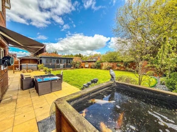 The superbly maintained rear garden offers a large lawn, generous patio space, and an impressive log cabin—perfect for a home office, gym or relaxation room. A covered hot tub area adds a luxurious touch.