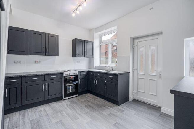 Breakfast Room. Grey Lino Flooring. Fitted Dark Grey Kitchen with Laminate Worktops. Free Standing Cooker. Stainless Steel Sink with Drainer and Chrome Mixer Tap. Double Glazed Window to the Rear. UPVC Rear Door. Encased Combi Boiler. Pendant Light. Plumbing for Washing Machine. White Splashback Tiles. Double Panel Radiator.