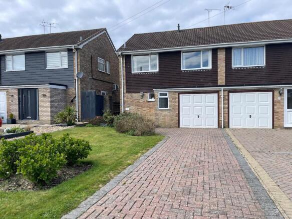The front garden is laid to lawn with shrubs and bushes. Block paved driveway.