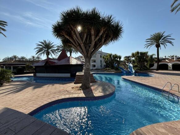The complex stands out for its **impressive lagoon-style swimming pools**, surrounded by spacious gardens, palm trees, green areas and water slides, creating a true Mediterranean oasis. An ideal environment to relax, enjoy with family or unwind during holidays.