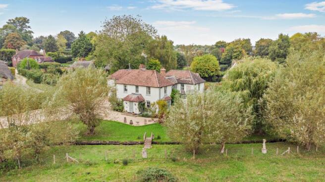 The gardens are mostly laid to lawn with a stock fence dividing the property form the water meadows. The gardens feel like they merge into a green oasis beyond where cattle are sometimes grazing and wildlife abound. Around the house there are planted mixed boarders for seasonal interest. A small brook flows through the garden which is particularly charming. There is a recently constructed green oak framed garage with room over on the driveway, which has plenty of party for a number of vehicles. The house is approached from the village lane by a gravel driveway and smart wooden electric gates.