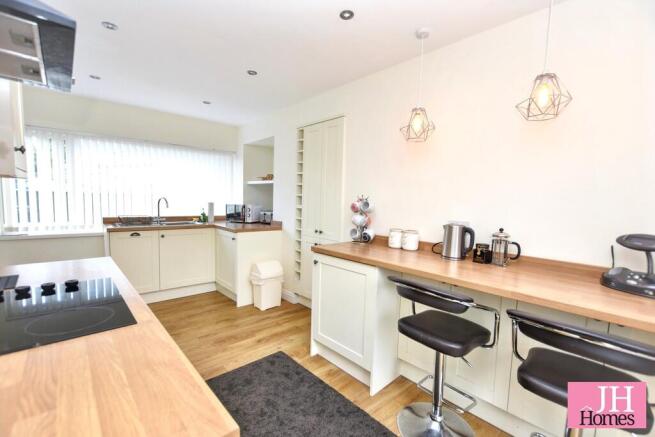 KITCHEN/BREAKFAST ROOM 16' 4" x 9' 3" (4.98m x 2.82m) Fitted with a range of base, wall and drawer units with wood block effect worktop over incorporating one and a half bowl sink with drainer, mixer tap and splash back tiling. Slimline dishwasher with matching decor panel, electric hob with stainless splashback and cooker hood above plus a low-level electric oven. UPVC double glazed window to the front with fitted blind and a fully glazed door to the rear with a roller blind, opening into the rear garden area. Built-in fridge and a wall cupboard ideal for storage, plus a breakfast bar area. There is a hatch in the floor giving access to an unused basement area, and to the side of the kitchen, an arch through to: