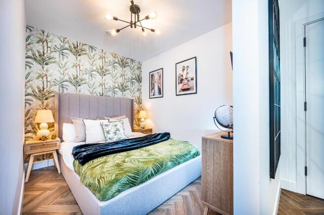 The lounge has a stunning and comfortable shaped sofa facing your 50" smart TV. With the pop of the stunning feature wallpaper the apartment is kept modern but with a bit of life to it!