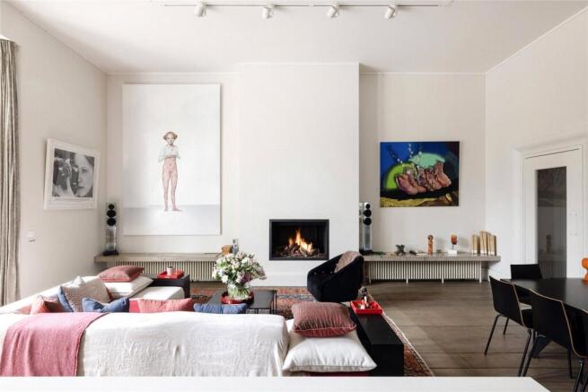 Inside, heritage formality softens into contemporary ease. The main reception room commands the ground floor – a voluminous, light-filled expanse that sets the tone for the home. Classical bones are given a modern cadence: high ceilings, crisp detailing and an understated palette that amplifies light. A grid of recessed spotlights defines the centre of the space, while near floor-to-ceiling glazing opens to a secluded terrace.