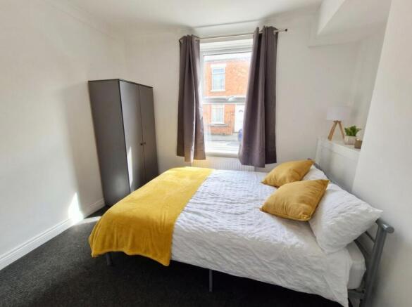 A furnished double room, offering a practical and well-presented living space. The room includes a bed, wardrobe, and additional storage, making it ready for immediate use.