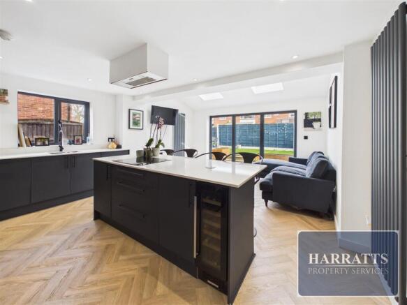 To the rear is the extended kitchen/diner, which is undoubtedly the standout feature of the home. This eye-catching space boasts a modern fitted kitchen with a range of wall and base units, complemented by a central kitchen island with breakfast bar. Integrated appliances create a sleek finish, while bifold doors open out onto the rear garden, allowing for plenty of natural light and ideal indoor-outdoor living.