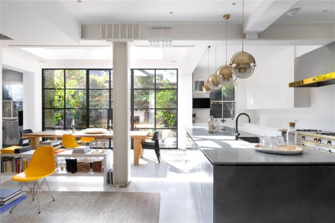 Situated on the lower-ground floor, the open-plan kitchen and living room demonstrates a balance between stylish and industrial interior design. The bespoke Boffi kitchen features a granite-toned island and large range cooker, accented by gold hardware and a series of gilded pendant lights. The sprawling footprint can be zoned into seating and dining areas, all united by poured concrete floors. Through an archway, find a snug family room. Crittall glass spans the entire rear extension, channeling sunlight across the room’s spacious proportions. Outside, a walled garden is filled with verdant planters – making for a tranquil al fresco setting.