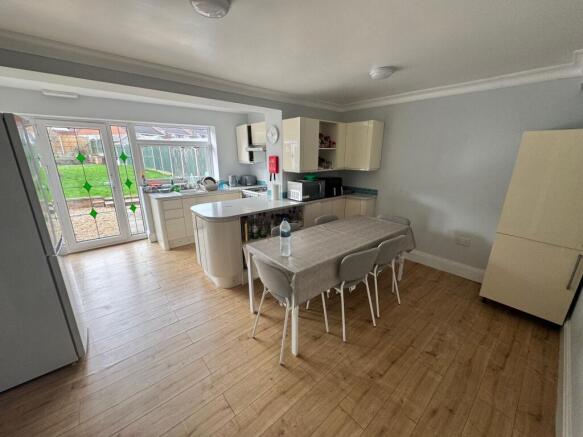 Upon entering the property, you are welcomed into a comfortable lounge area featuring sofas and a TV unit—ideal for relaxing or socialising. To the rear, there is a large, contemporary kitchen and dining space complete with oak-coloured laminate flooring, cream unit doors and drawers, and a stylish grey worktop. The kitchen is fully equipped with essential appliances and ample storage, alongside a dedicated dining area with furniture. A rear glass door provides access to the generous garden. The ground floor also benefits from a separate utility area with washer and dryer, as well as a convenient downstairs toilet.