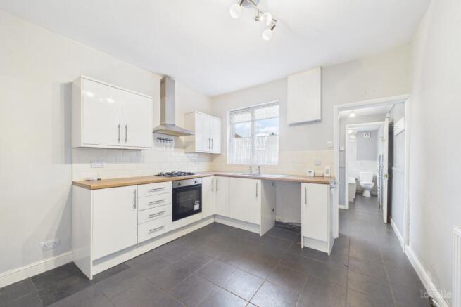 Range of wall and base units with contrasting work surfaces and decorative tiled splashbacks. Stainless steel sink and drainer with hot and cold water taps. Inset electric oven with a four ring gas hob and an extraction canopy over. Space for a tall fridge freezer and plumbing for a washing machine. Window to the rear elevation overlooking the courtyard.