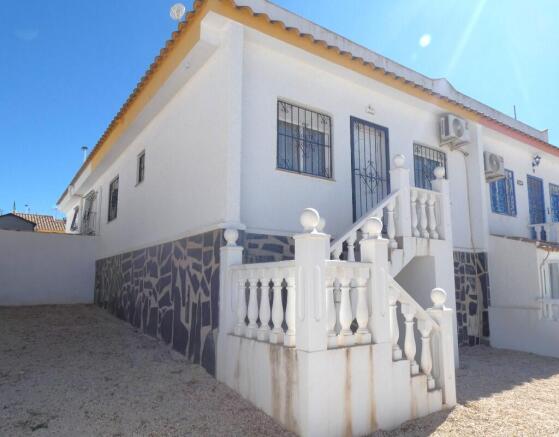 Pedestrian access is via a low-level metal gate which opens onto a small garden area, which is also laid to shale. If the off-road parking area was forfeited then there would be room for the installation of a small pool, this would enhance the attraction of the villa, combined with raised walls which would provide privacy this would make the perfect retreat for relaxing and enjoying the hot summers. Tiled stairs to the front of the villa with decorative balustrades and handrail lead to the front door.