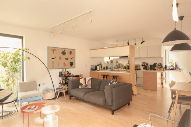 At the end of the hall, the best bit awaits! Your roomy main room which incorporates kitchen, lounge and dining spaces. It is a natural room for entertaining, with studio-style lights (plus pendants over the dining area) and with a sleek modern kitchen (integrated appliances are included in the sale). Underfloor heating flows throughout. Double-glazed double doors deliver you to your notably private lawned garden which gets plenty of sun.