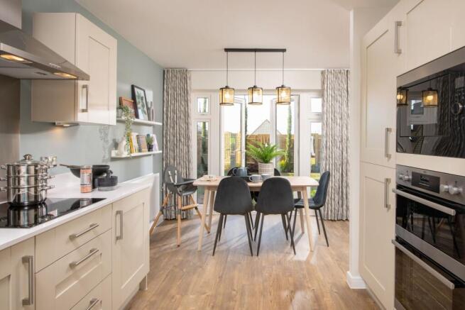 From the entrance hallway, you are drawn into the open-plan kitchen and dining area which offers an appealing U-shaped layout – ideal for entertaining and gathering the whole family together. There is plenty of room for a dining table in the layout, plus a practical integral cupboard for storing away appliances, or creating a pantry.