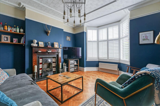 The property opens via a period porch into a welcoming entrance hall with decorative tiled flooring. The bay-fronted living room is both cosy and stylish, featuring dark contemporary tones, a reclaimed parquet floor, bespoke shutters and a striking period fireplace. To the rear is the impressive heart of the home an extended open-plan kitchen, dining and sitting space filled with natural light. The shaker-style kitchen is complemented by Corian worktops and integrated appliances, including a Fohen boiling tap, Bosch electric hob, oven, fridge freezer and dishwasher, along with a central island providing additional storage and seating. This space flows into a generous family area and a bright dining extension with a roof lantern and bi-fold doors opening onto the garden. There is also access to a useful cellar, ideal for storage or future development.