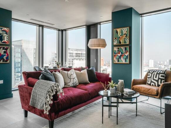 This apartment features a quartz-topped kitchen with premium Samsung appliances and a four-seater dining table. The light-filled living area includes a plush sofa, 50” Samsung 4K TV, and mirrored coffee tables. Both bedrooms have fitted wardrobes, ottoman beds, and luxury mattresses. Bathrooms include en-suites or house baths, all with rainfall showers, heated towel rails, and LED-lit vanities.