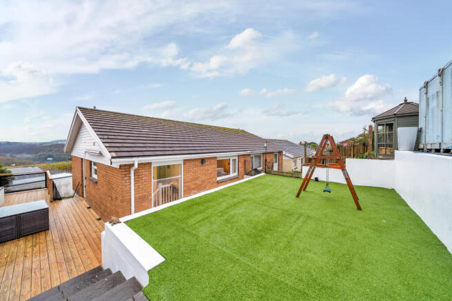 The decked sun terrace wraps around the side of the property, creating a raised patio area that is perfect for enjoying the surrounding views. The rear garden is terraced over three levels, laid with astro turf for ease of upkeep, offering additional outdoor space to relax or entertain. A rear access gate at the top of the garden leads onto Goonwartha and further on road parking.