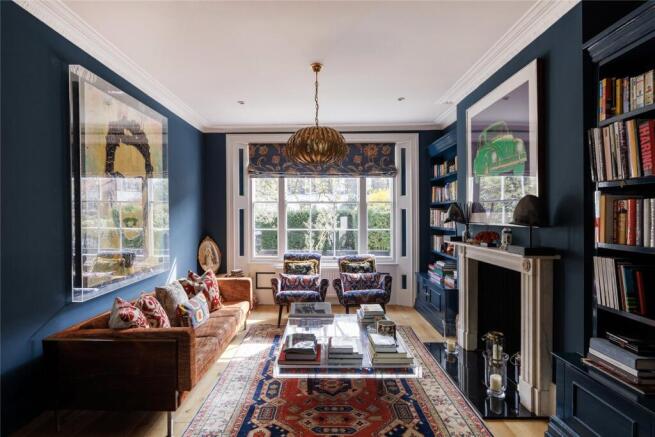 From the ground floor, a sequence of reception spaces reveals itself with an impressive sense of scale. In the principal reception area, layered textures, vintage rugs and striking artwork create an expressive backdrop. Adjacent, a second seating area takes on a more gallery-like quality with striking wall art. To the rear, a dining room is bathed in natural light beneath an expansive glazed roof, where eclectic furnishings and garden views enhance the sense of openness. A separate study provides a quiet retreat for home working.