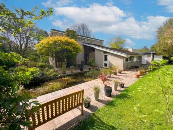 The house is surrounded by mature and beautifully established gardens, laid predominantly to lawn and stocked with specimen trees and shrubs. A front lawn wraps around to an enclosed rear garden featuring a large ornamental pond and sandstone paved seating areas, while to the opposite side lies a substantial level lawn ideal for family use, again bordered by flower beds and mature planting, creating a private and tranquil setting.