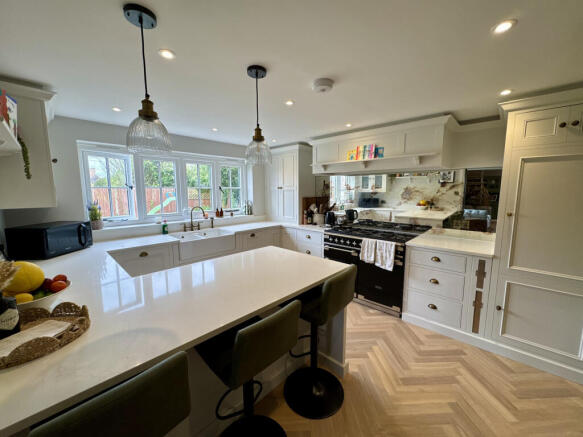 Flowing through, you arrive at the stunning Neptune kitchen, fitted with Chichester units and finished to an exceptional specification. Radianz Calacatta Amber quartz worktops provide a luxurious surface, complemented by a double ceramic butler sink. A bespoke antique-effect mirrored splashback adds a unique design touch. The adjoining utility room continues the high-end finish, with additional wall and base units, herringbone marble mosaic tiles, and space for white goods. From here, there is convenient side access, along with a stylish downstairs shower room featuring metro tiles and Victorian patterned flooring.
