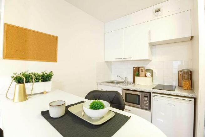 A compact and functional space featuring a cozy double bed, dedicated study desk, private kitchenette, and en-suite bathroom. Ideal for students seeking a private, budget-friendly option.