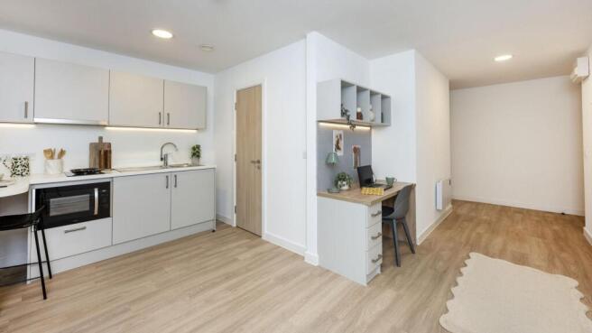 Luxury Studio offers beautifully designed living space, featuring a double bed, ensuite bathroom, study area, ample storage, and a private kitchen for comfortable independent living.