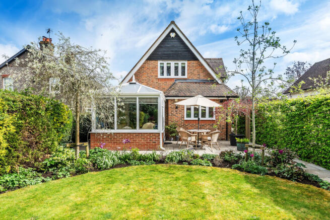To the rear, the enclosed garden is equally appealing, featuring beech hedging, a level lawn, and an additional side section adjacent to the garage, offering both privacy and usability.