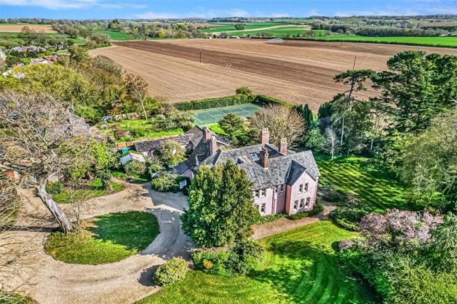 The grounds of this wonderful country house are a most appealing feature being well maintained and delightfully arranged with good rolling countryside views across farmland to the south. The property which is set well back from the road is approached through a wrought iron gated entrance over a long-gravelled driveway leading to a carriage turning circle to the front of the house, which splits off between wrought iron lamp posts to the former stable and coach block to the side and the garage. A wall to the side of the house screens the former service wing and outbuilding that now houses the indoor heated swimming pool with associated changing room, shower and ‘plant’ room. There is also a tool shed and workshop. The modern ‘all weather’ hard surface tennis court is fence enclosed. The gardens offer a charming mix of lawns and terraces with shrub and flower beds and borders and there is impressive selection of mature specimen trees with ‘Lime Avenue’ walk from the carriage drive to the neighbouring church being of particular note. There is also a meadow to the side, that is currently open to, but not part of the church grounds. The gardens and grounds extend to around 2.93 acres (sts).