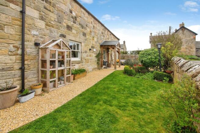 The property is approached via a charming timber-gated entrance, leading to beautifully maintained gardens which wrap around the home. The grounds are predominantly laid to lawn with attractive planters, borders and uninterrupted views across surrounding fields, creating a peaceful and picturesque setting. A stone-built outbuilding provides useful external storage, while allocated parking is situated to the rear