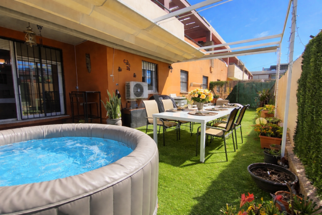 Beautiful 3-bedroom ground-floor apartment with private garden, jacuzzi, and communal pool.