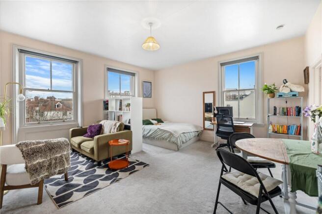The studio room itself is an excellent size, offering ample space to comfortably zone both living and sleeping areas. In addition, there is a separate modern kitchen, thoughtfully designed and well-proportioned. The accommodation is completed by a contemporary bathroom suite with a shower over the bath.