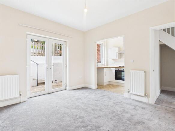 The ground floor is accessed via an inviting entrance hall that serves as the central artery for the lower level. To the front, a spacious living room features a bay window that allows for plenty of natural light to fill the room. The rear of the house is occupied by a separate dining room, which benefits from direct access to the outdoor areas through folding doors, and a compact kitchen designed for efficient daily use.