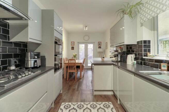 Two double glazed windows to side aspect, double glazed double doors onto rear garden, radiator, range of wall and base mounted units with work surfaces over, inset stainless steel sink and drainer with mixer tap over, integrated appliances including high level electric oven, gas hob with extractor over, fridge freezer, dishwasher, and washing machine, corner pantry cupboard, breakfast bar, laminate flooring.