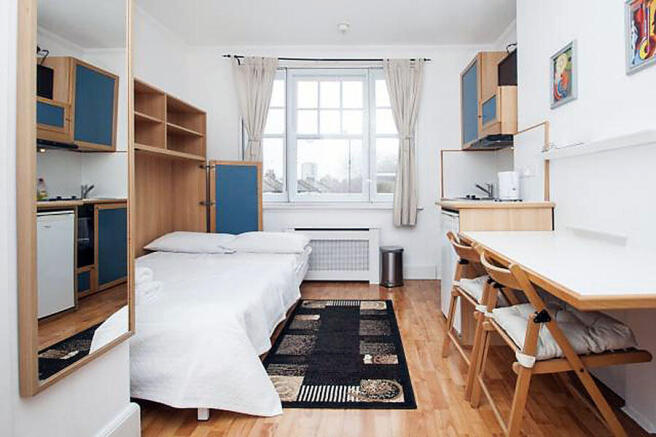 The studio features a space-saving double pull-down bed, wardrobe, table, coffee table, chairs, and a flat-screen TV, finished with laminate wood-effect flooring throughout. The open-plan kitchen is fully fitted with an oven, cooker, fridge/freezer, microwave, kettle, and fitted storage units, along with essential crockery, cutlery, and glassware. The en-suite tiled bathroom includes a power shower, toilet, wash basin, and a heated towel rail. Tenants benefit from free fibre optic Wi-Fi and secure building access via electronic fob keys, CCTV cameras, and a video entry phone system. Additional shared facilities include a landscaped communal garden, a spacious lounge area, reception space, and secure bicycle storage.