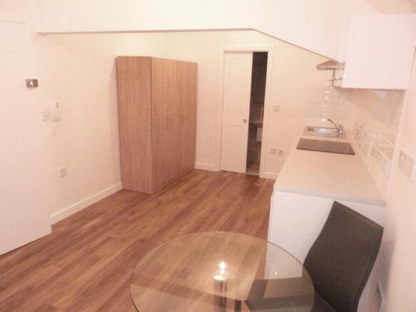 This studio apartment comes with laminate flooring and a fully fitted kitchen including white goods. A wardrobe and table and chairs is also provided