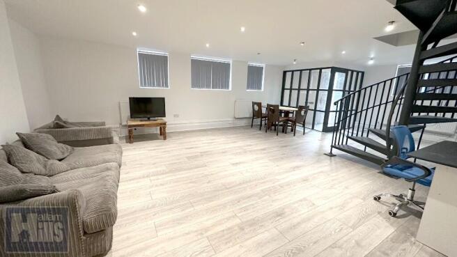 LIVING ROOM Laminate flooring brilliant size, dining table, black leather chairs, sofas and TV and large windows making it bright.