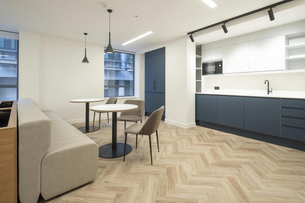 The available floors provide fully fitted and furnished office space with two meeting rooms, 24-26 desks, kitchen and breakout/collaboration areas.