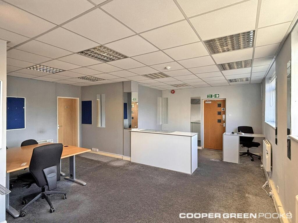 Inside the unit is open plan with a smaller storage/office room on the left hand side and a cupboard on the right hand side once you come through the door. The flooring is carpeted, there is a suspended ceiling with recessed lighting, perimeter trunking with ample sockets and electric heating panels along the external wall. There is also a toilet to the rear of the unit and a fire escape.