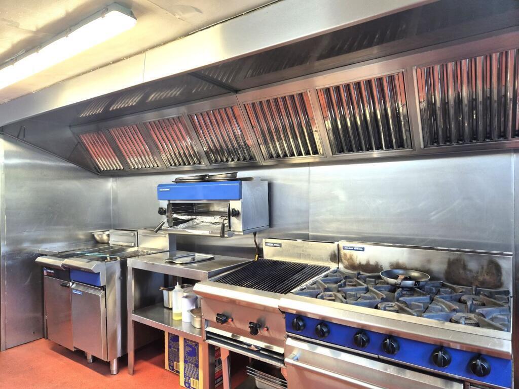Very well presented with a full range of kitchen equipment including six-ring hob and oven, gas griddle, combination oven, two double deep fat fryers, commercial dishwasher and a full range of stainless steel refrigerated workstations.