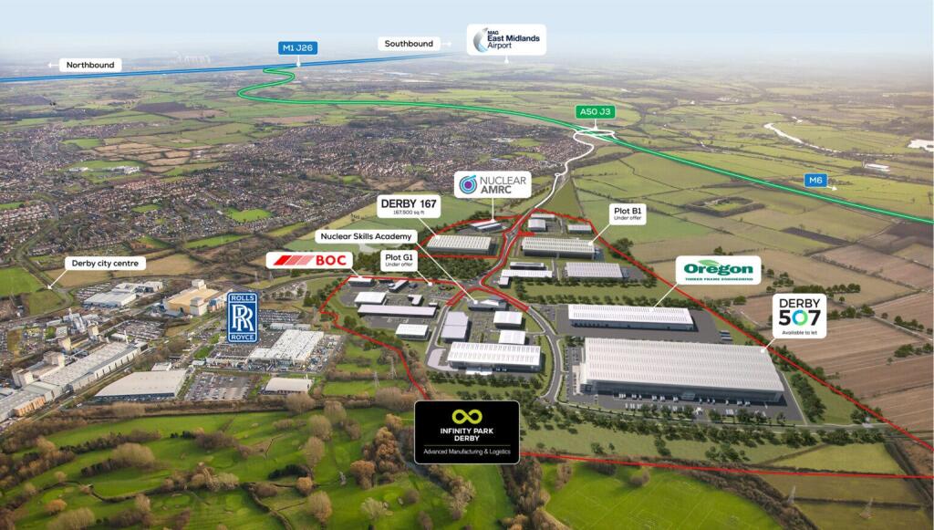 Infinity Park Derby, the East Midlands’ premier advanced manufacturing and logistics location. Spanning 100 acres, the Park is located to the south of the city, next to the world headquarters of Rolls-Royce Civil Aerospace and within 15 minutes of blue chip OEMs such as Toyota, Alstom and JCB.
