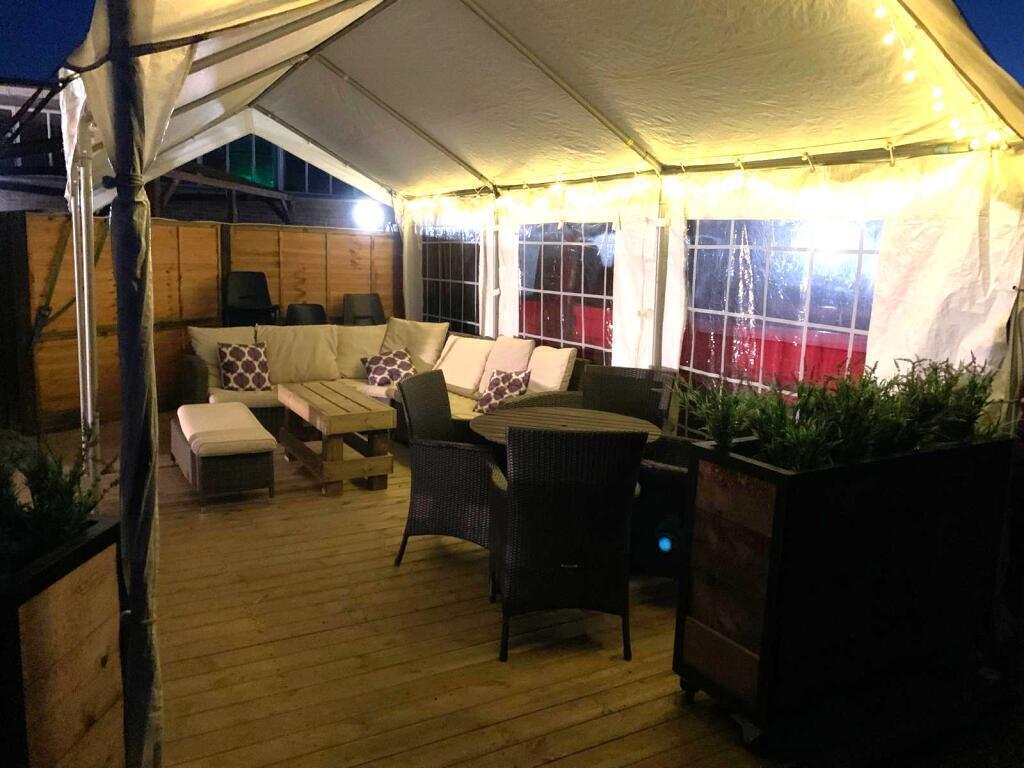 Located to the side and rear easily seating around 65, this area has a mixture of patio flooring and wooden decking and is mostly covered by gazebos.