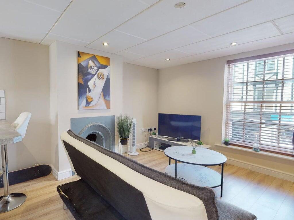 The largest apartment located on the top floor with two double bedrooms and a balcony. The split-level accommodation comprises; hallway with Velux roof light, fitted kitchen with granite tops and upstands and integrated appliances, adjoining living room with bi-fold doors leading onto the balcony with outside lights, power points, and cold water tap; two double bedrooms (bedroom one overlooking the High Street) and a large bathroom benefitting from a sun tunnel with a freestanding bath and ‘wet floor’ shower. EPC Rating D, Council Tax Band A